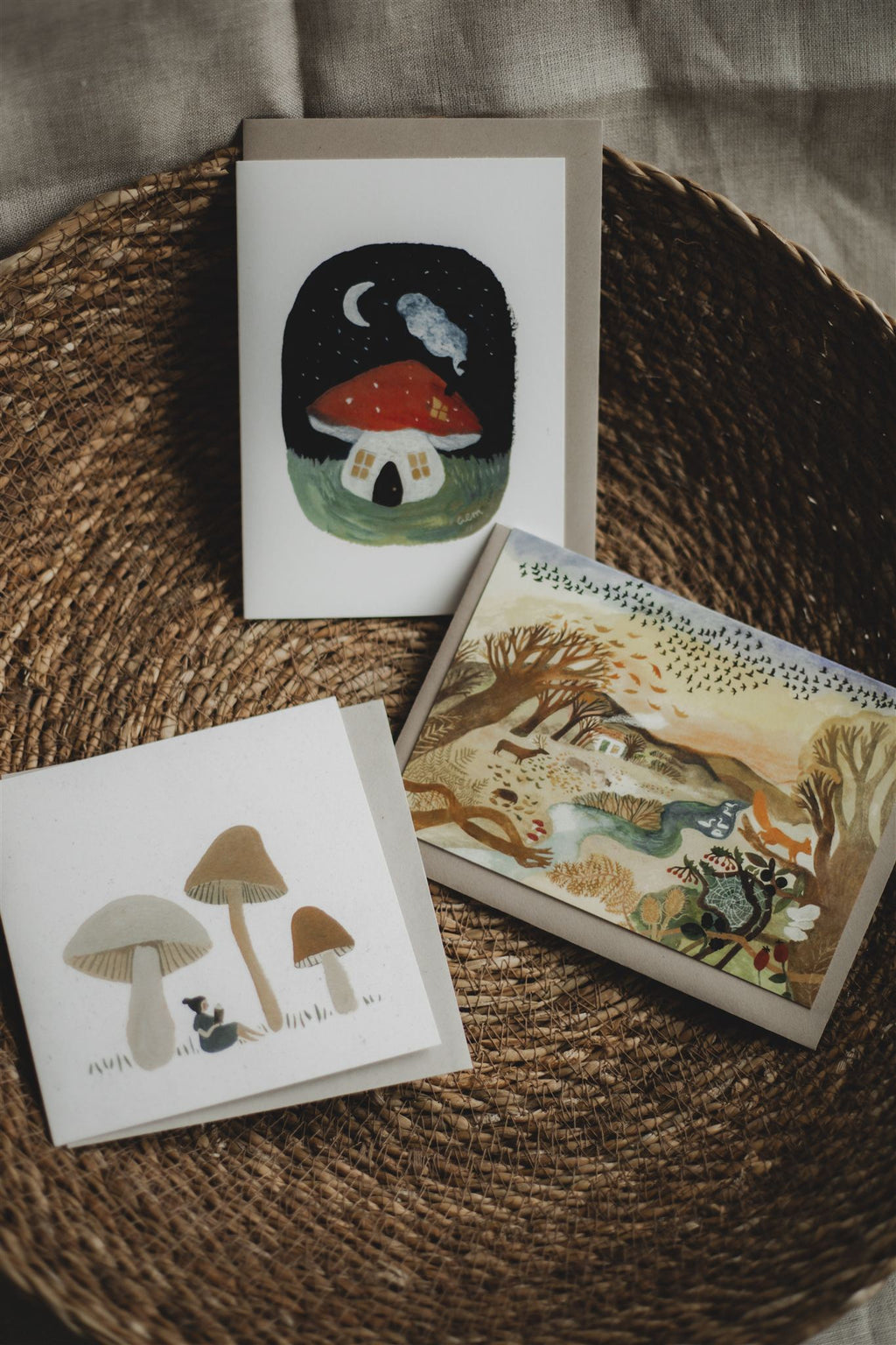 Illustrated to showcase a cosy image with Autumn's characteristic toadstool taking centre stage as a tiny cottage made for faerie folk. Measures A6 size.