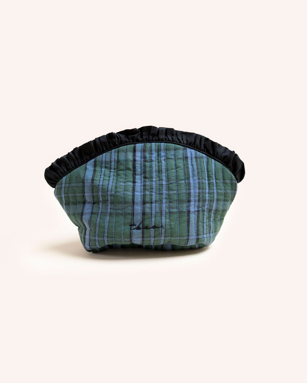 Crafted from pure cotton, this soft wash bag with its green modern take on traditional tartan, crescent form and ruffled zip opening is a beautiful storage space for your bathroom essentials.