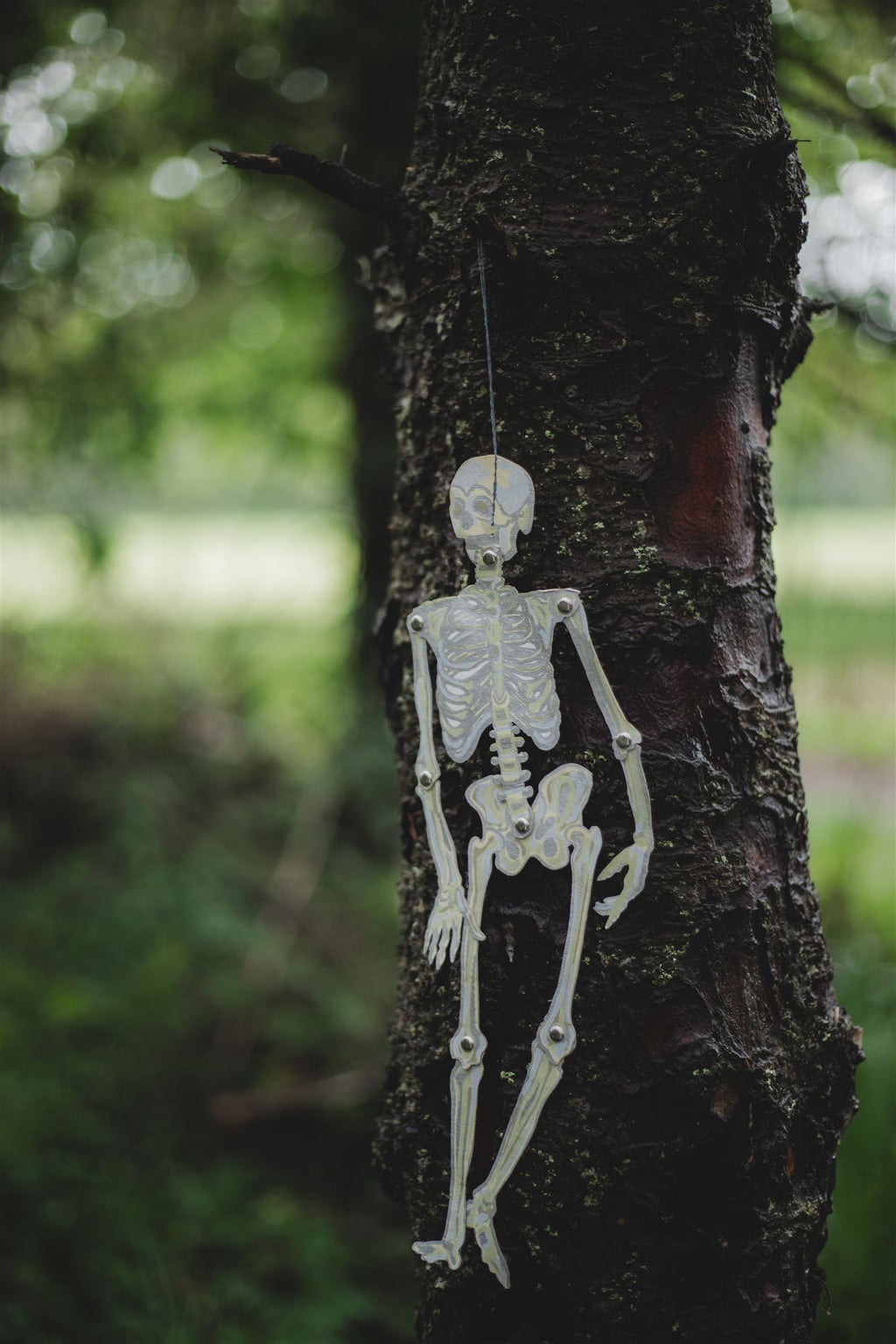 Step into spooky season with this set of two hand-printed paper skeletons to hang from your Halloween decor!