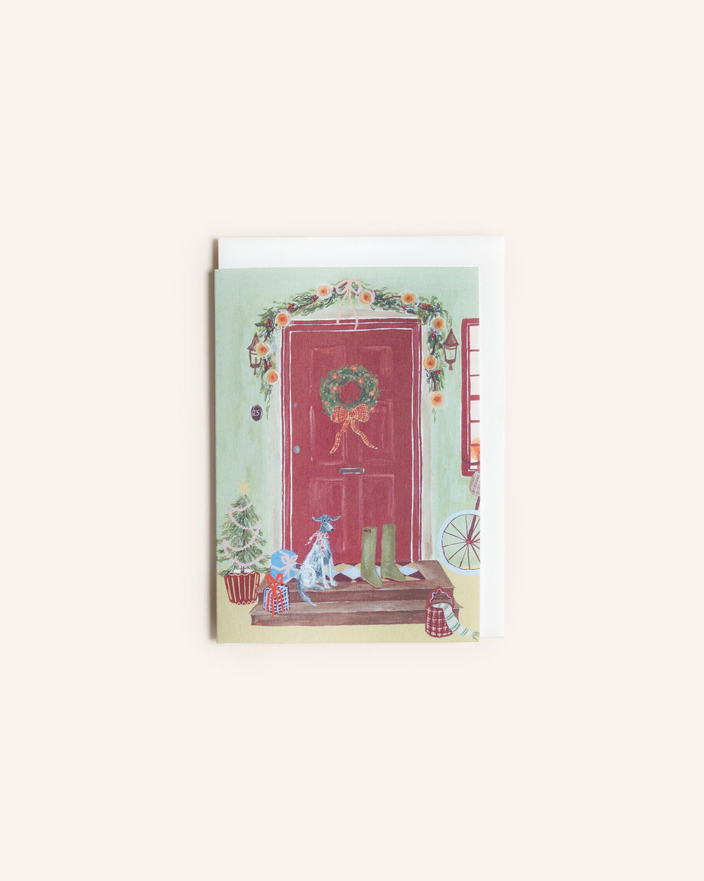 Depicting an adorably festive front door with its bow-tied wreath, welly boots and little dog, all imagined and hand-painted using gouache by Harriet before being reproduced into this sweet greeting card for the season.