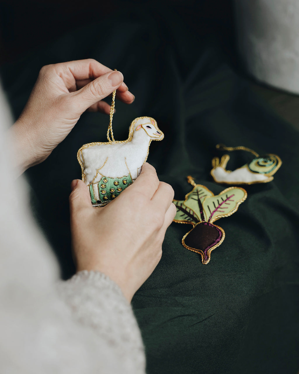 Every decoration has been embellished with shimmering metal thread embroidery by hand onto cotton fabric, then filled with recycled plastic wadding for sustainability and to keep its plump shape over time.