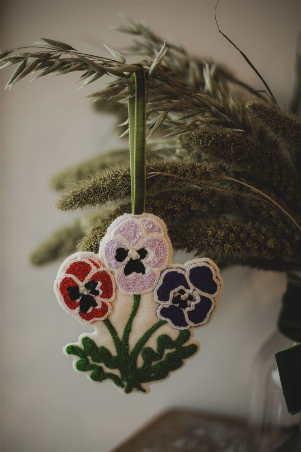 Every winter pansy is hand-embroidered with chainstitch onto an ivory-coloured woollen off-cut for sustainability, then finished with a luxurious green velvet ribbon so it's ready for hanging on your tree.