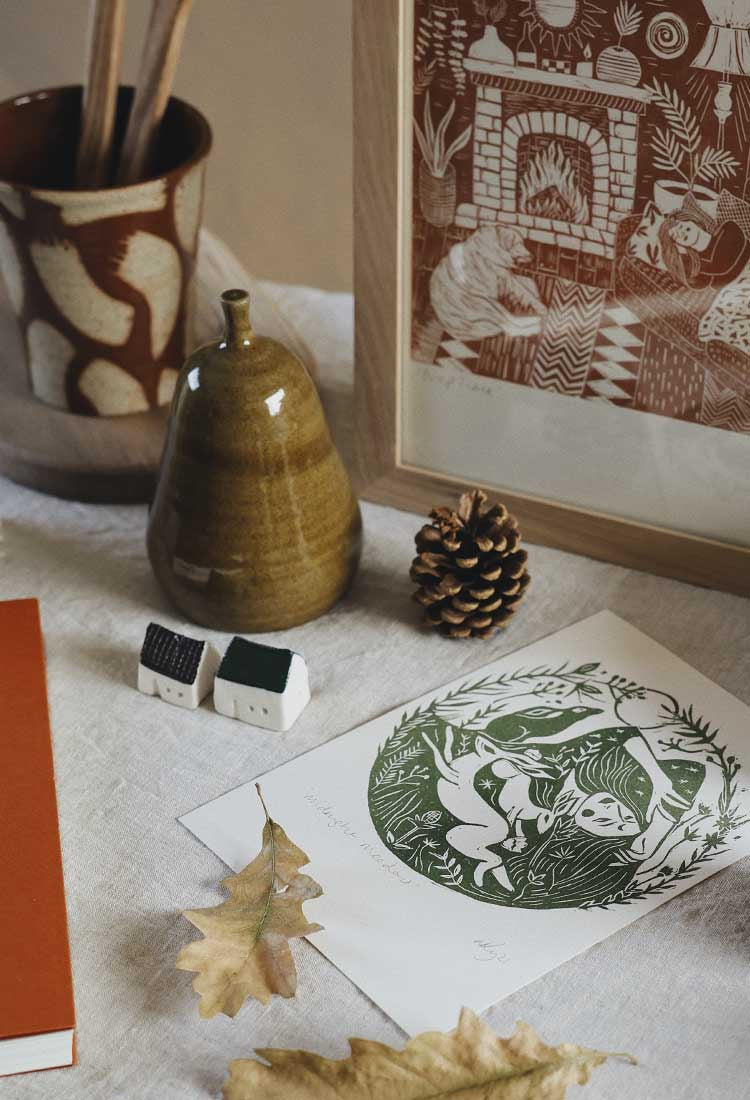 In this particular print, Nicole is inspired by Wiccan and pagan references, with three hares leaping under a full moon alongside her trademark female iconography. It's calming green tone makes it perfect for adorning any wall in your home or treating a loved one who's intrigued by a little witchy magic.