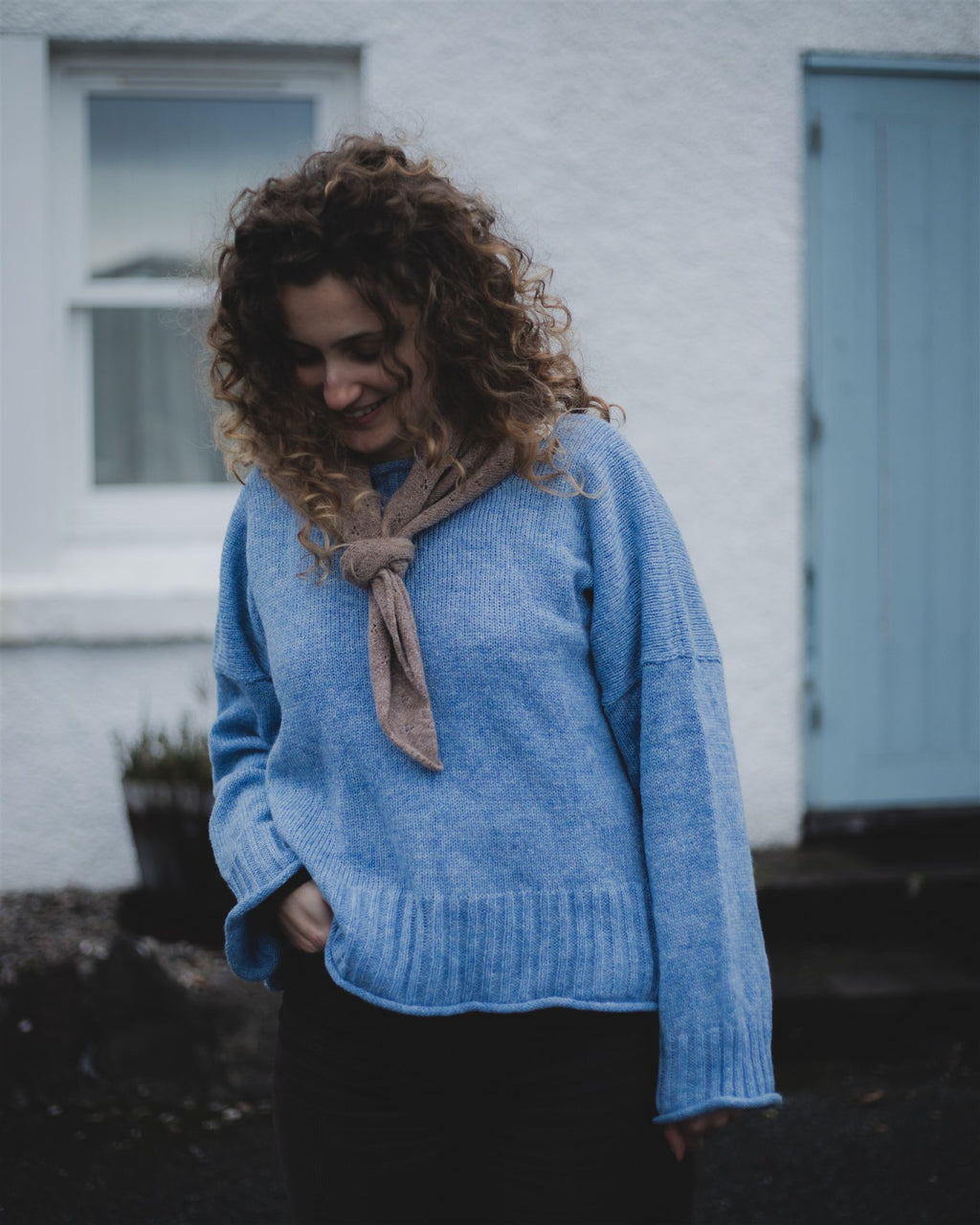 This cosy, oversized jumper is made on a domestic knitting machine with seams linked together by hand using pure 100% new Shetland wool in Edinburgh by Kirsty Campbell, founder of Ryvoan.