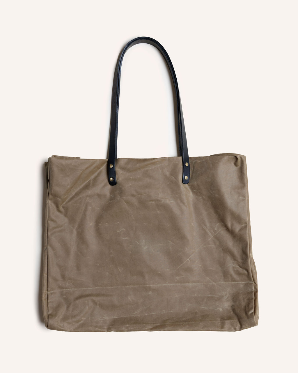 Its water-resistant waxed cotton in a soft Sand colourway has a slightly antiqued, distressed appearance with intentional creasing and it includes sturdy, vegetable tanned leather bridle handles. The cloth is sourced from an independent business in Dundee with over 150 years' experience in creating waxed cotton using quality craftsmanship and sustainable practices.