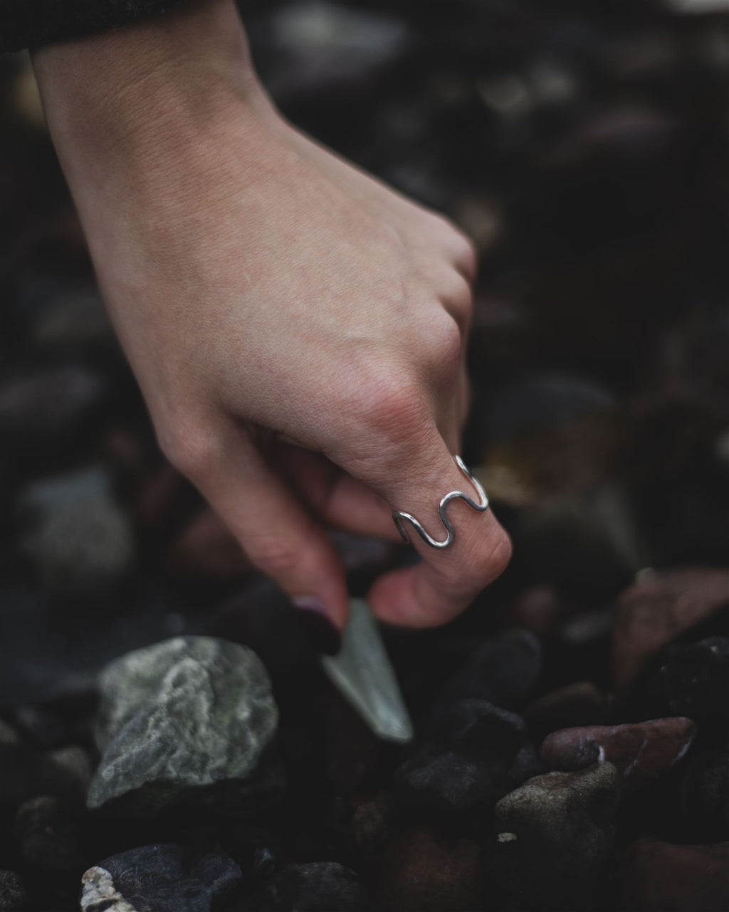 The handcrafted wiggle ring has a subtle hammered design, reminiscent of the waves crashing against the rocks in Cornwall's Trevaunance Cove; a beautiful seaside spot near Becky's childhood home.
