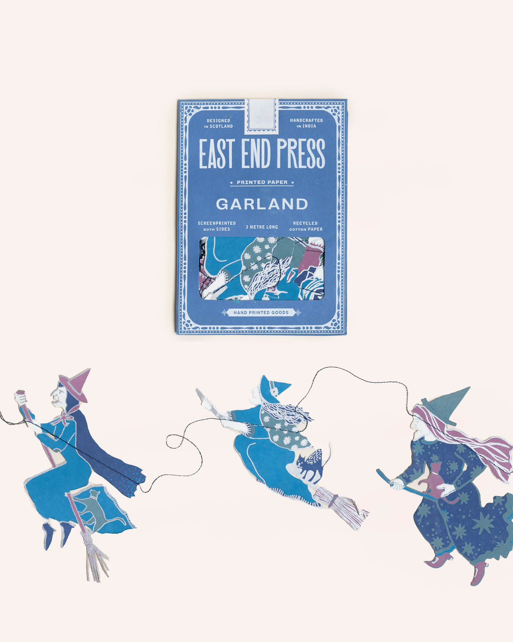 Flying on their brooms along its length you'll find ten witches and their feline friends screenprinted by hand on both sides. The designs are printed onto thick, handmade, recycled paper for sustainability and each end features a sewn cotton thread so it's ready for hanging.