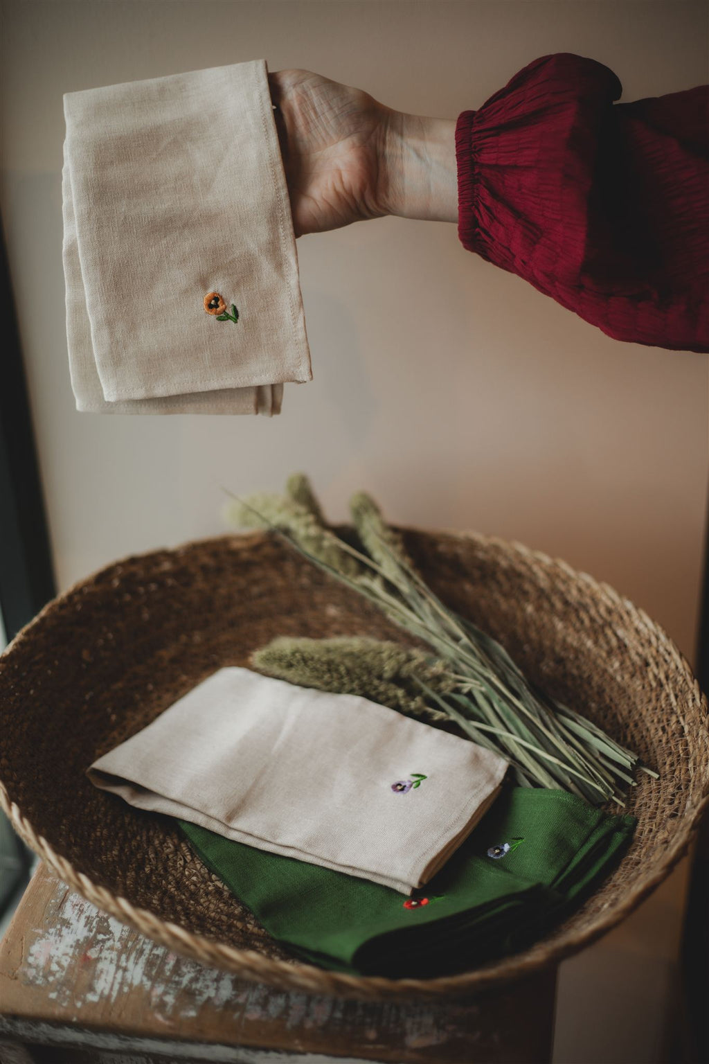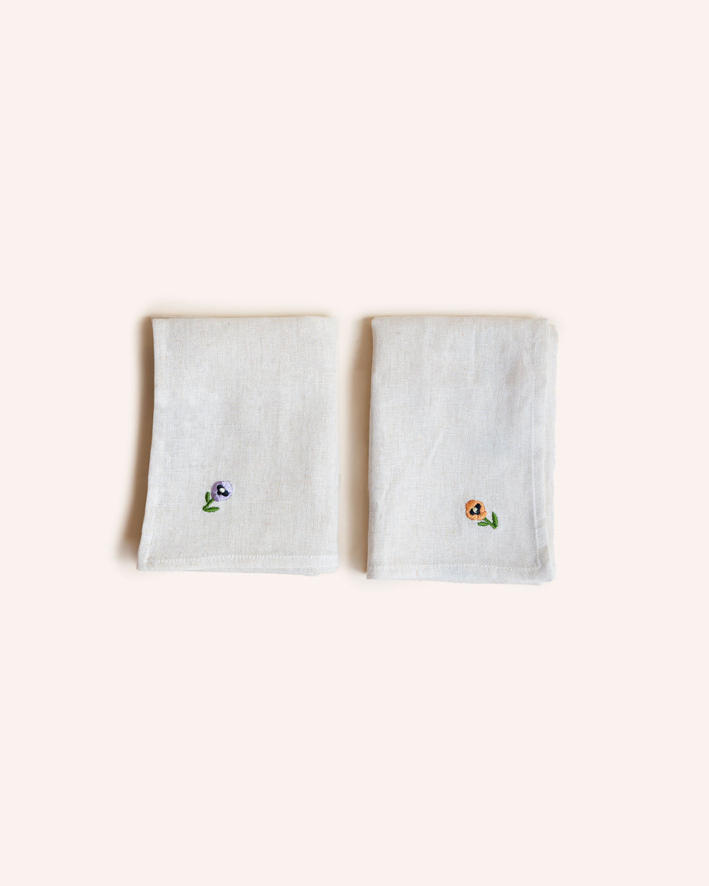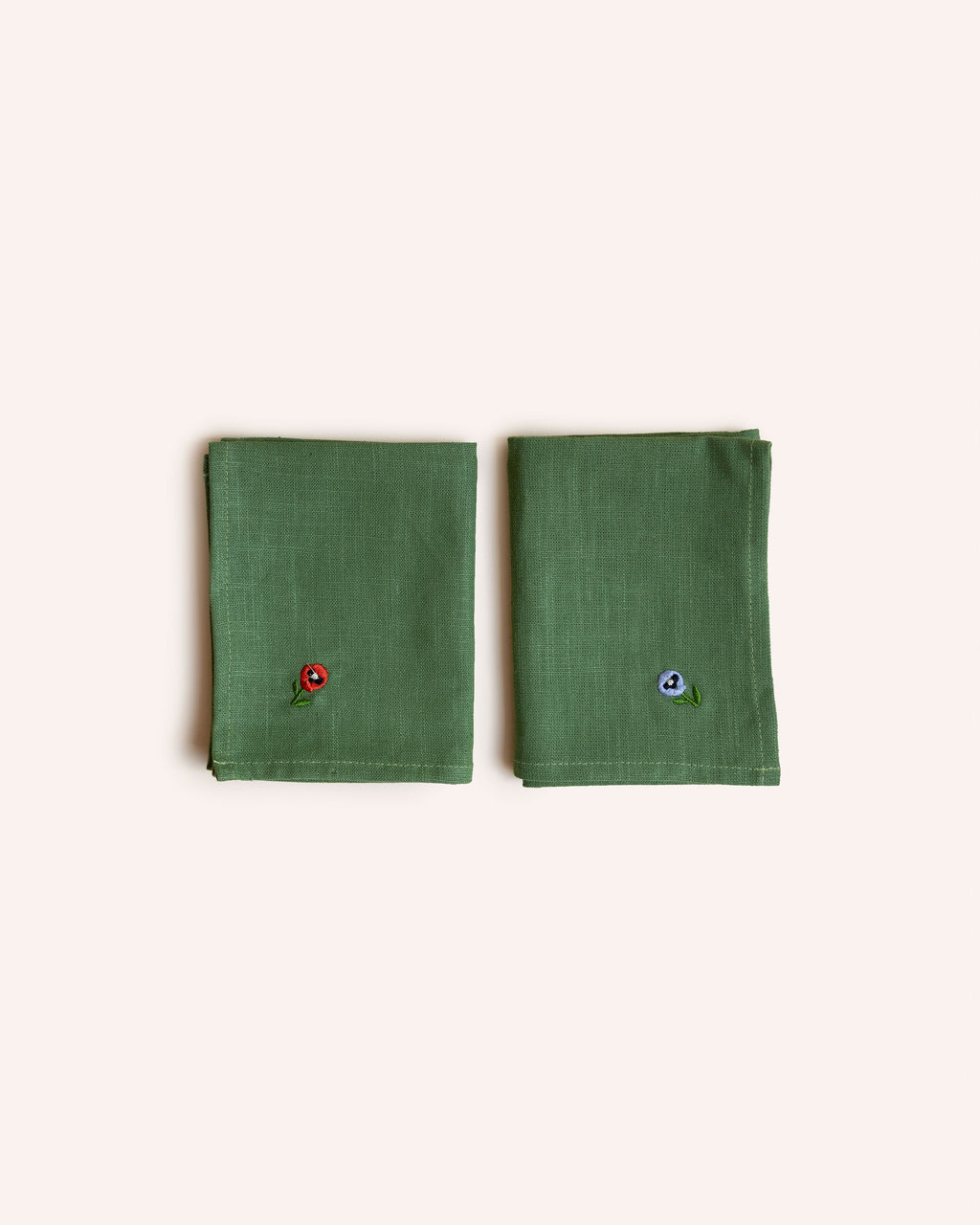 This assortment of two green and two creamy white napkins are each hand-embroidered with a delicate pansy in a different colour, ready to bring charm to your table.