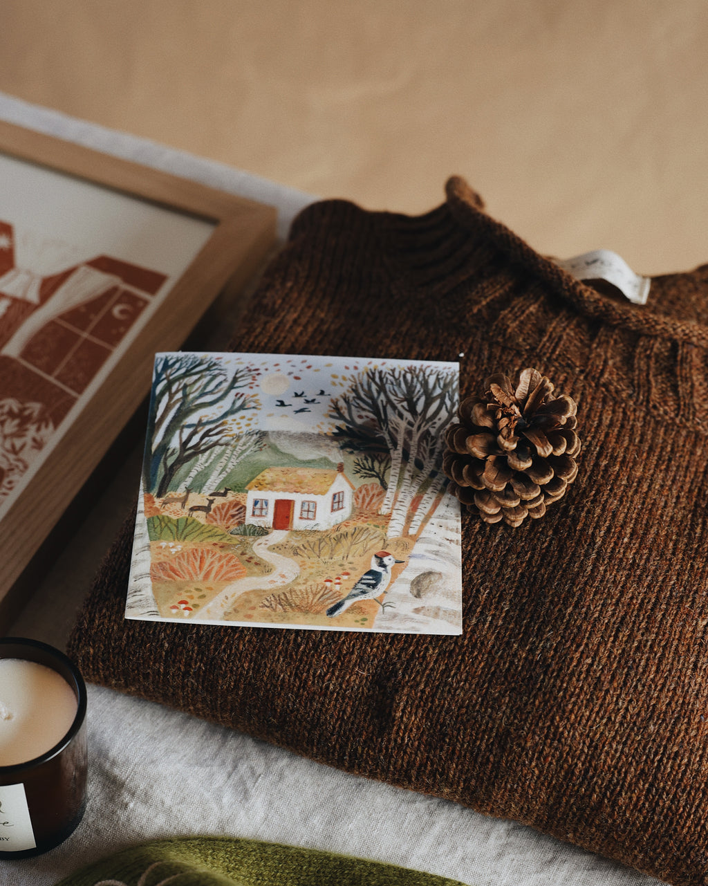This serene cottage scene with its meandering woodland trail is designed and made by illustrator Gemma Koomen in her Northumberland-based studio. It's printed onto FSC-certified recycled card in Britain and comes with a natural coloured recycled paper envelope and biodegradable cellophane sleeve. Blank inside. Measures 12 x 12cm.